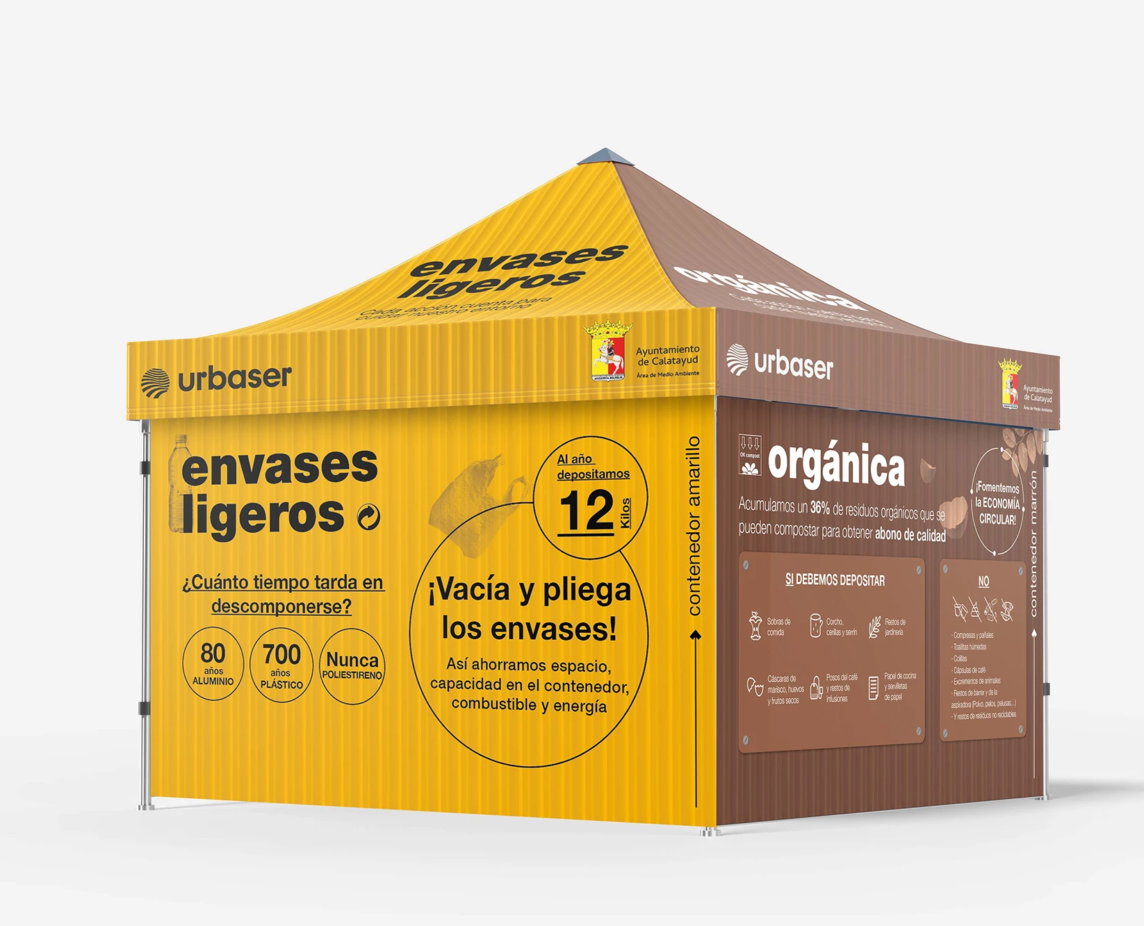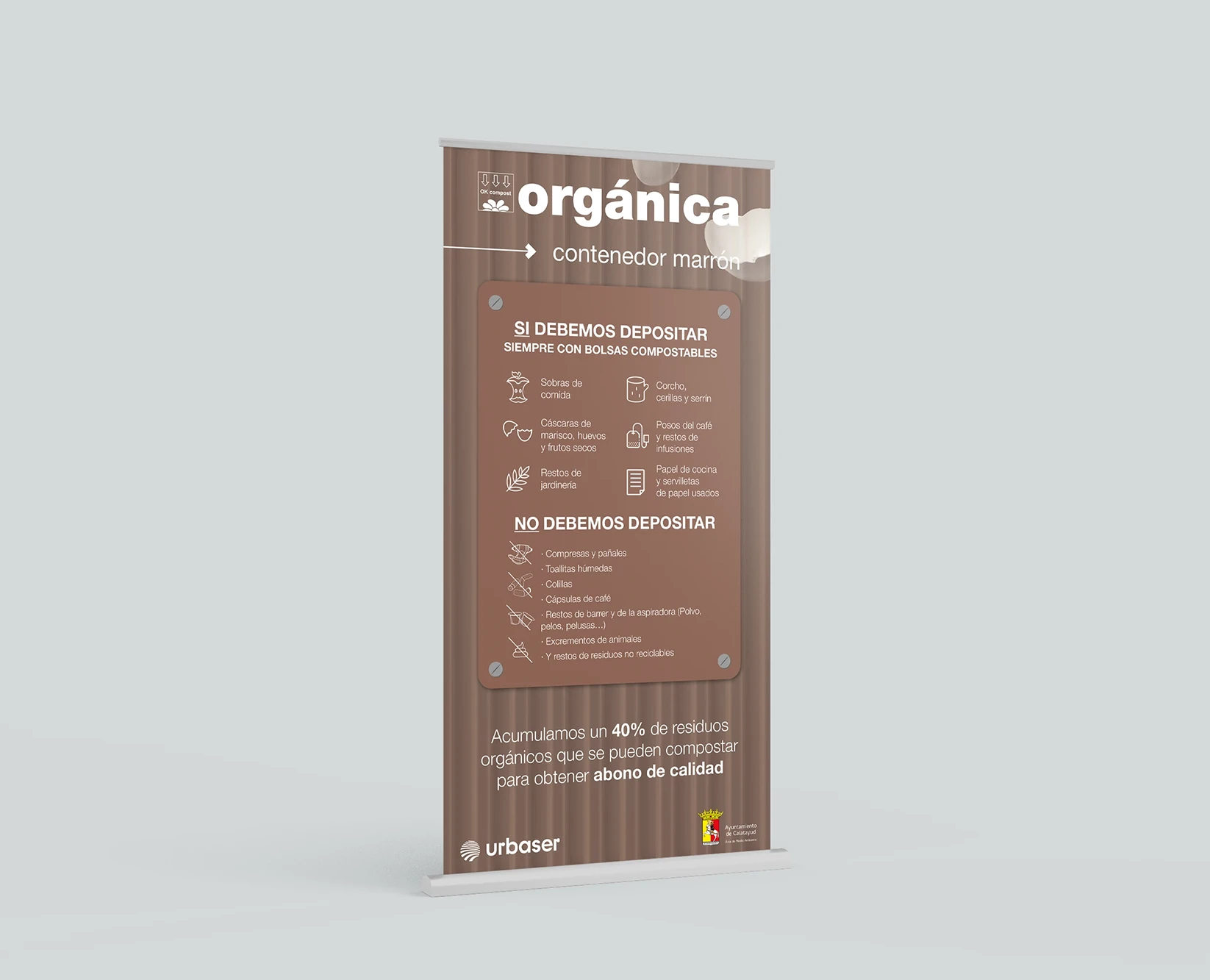 Para su difusión diseñamos un punto de información móvil propio: carpa personalizada y roll up con la imagen de campaña, donde dos monitores resolvían dudas sobre el uso de los contenedores de envases y de la fracción orgánica. A la vez que informaban, entregaban los calendarios a las personas que se acercaban, convirtiendo cada consulta en una oportunidad para mejorar la limpieza de la ciudad y reforzar el compromiso de la ciudadanía con su entorno.